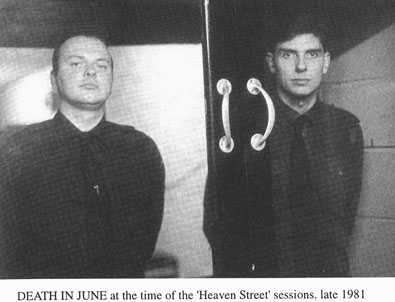 Не знаю почему, но у меня возникает ощущение, что строчка из песни Current 93 “A Song for Douglas (after he’s dead)” – “…under two willow trees with elhaz inverted” – (“между двух ив – перевернутый Эльхаз”; Эльхаз – один из вариантов прочтения руны Альгиз) имеет непосредственное отношение к если не к самому названию Death in June, то, по крайней мере, к символике группы.
