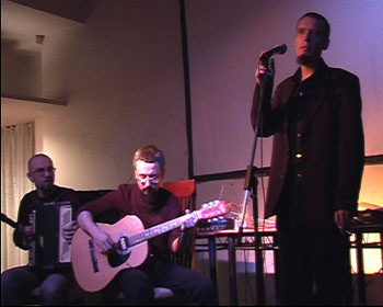 - "Гамлет". В составе группы появился скрипач, который очень удачно вписался и роль которого на мой взгляд не менее важна, чем аккордеониста. Звук был весьма похабный, как изрёк Павел (вокалист группы) - "это был панк-рок". Инструментальные микрофоны постоянно "заводились", а микрофон вокалиста как мне показалось, вообще не был подключён - на пультовой записи голос практически отсутствует. Всё больше убеждаюсь, что исполнение акустики в подобных "гадюшниках" портит репутацию не столько клубу, сколько самим музыкантам, и я бы на месте Majdanek Waltz наотрез бы отказался больше там выступать.Четвёртой группой были уже весьма популярные среди индустриальщиков и хорошо известные в "буржуинии"
